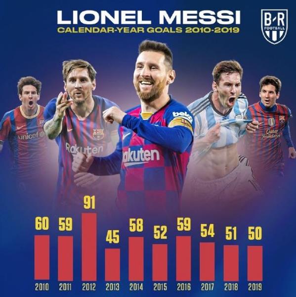 在進球方面,梅西可謂是登峰造極,2010年他攻入60球,2011年則是59球,2012年是恐怖的91球,至今無人可破。2013年45球,2014年58球,2015年52球,2016年59球,2017年54球,2018年51球,以及2019年50球!