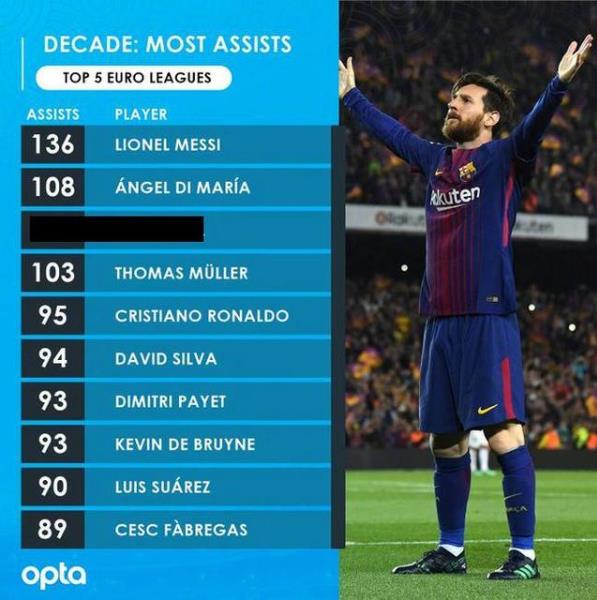 梅西不僅進球數量驚人,他更是過去10年助攻次數最多的球星。OPTA數據透露,梅西過去10年送出136次助攻,毫無懸念排名第1,而C羅則是以95次排名第5,足見梅西是多么全面的球員,這也是他備受球迷喜愛的原因。