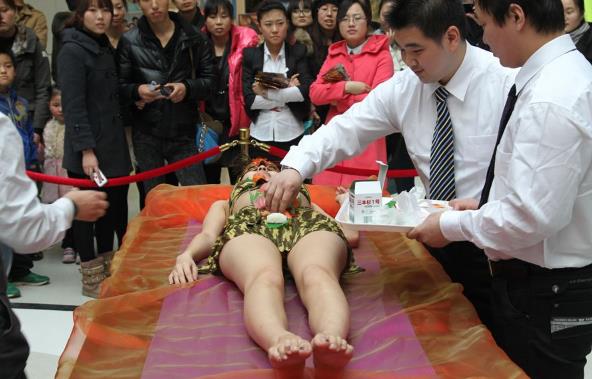 2016年4月30日,廣東東莞一商場內驚現美女“人體盛宴”,一美女人體彩繪模特擺造型躺在一個5米的超大型青花瓷巨碗上,身邊擺放有各種美食供市民免費食用,吸引了眾多的市民排隊來觀看。據悉,這是該商場內十多家餐飲品牌聯手推出8個品種而搞得活動。