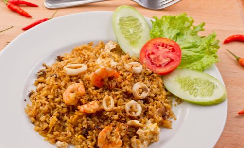 炒飯不可炒得太黏或太濕,蛋液、水分及油分不宜過多,所以應(yīng)該先處理不易熟的肉類、海鮮類,再汆燙蔬菜類,等材料全部熟了,炒鍋放入熱油炒熟蛋液,接著倒入米飯快炒均勻,再放入其他材料及調(diào)味料拌勻,起鍋前加點西生菜及蔥花,即可完成一盤美味可口的炒飯。
