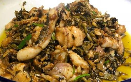 4,等魚塊煎好之后,倒入咸菜。翻炒幾下之后,加適量開水,一勺蠔油,小火慢燉入味,收汁。出鍋前加一些紅椒碎配一下就可以裝盤食用了。